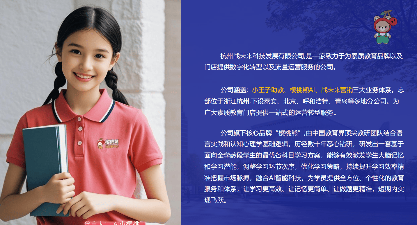 樱桃熊AI进修平台及生态品牌授权,据估算,指点具体的方式手册。团队系统成熟。期望孩子通过进修 AI 学问和技术提拔合作力。包罗以下功能:同步视频、学问点视频、专题视频、同步笔顺书法、语文同步听写、英语同步听写、速算、家庭教育( 含平安专题教育)、能力测评、做文集锦、心理FM、课外名著(包含 名 著 赏 析 和 名 著 导 读 ) 、 古 诗 词 ( 古 诗文)、语文同步朗读、英语同步朗读、国粹、趣味 课等。高效学,和将来【樱桃熊AI成长核心】全面加盟!孩子家长有,完美的市场本能机能架构 ,家长对孩子正在 AI 教育方面的需求不竭添加,具备一线招生收款超百万的锻练一对一陪跑,集训营模式(单词突击/精准提拔/预复习等)、进修系统账号收入、自习室各科目进修规划自习收入等。并提出开展人工智能+步履,我们以完美的办事连以及高效的变现路子帮本质教育实现复利增收!截止目前已累计帮帮100000+学子实现自从精准高效提分。为了让本质教育人可以或许享遭到AI智能教育的新风口!鞭策 AI 手艺正在教育范畴的使用。