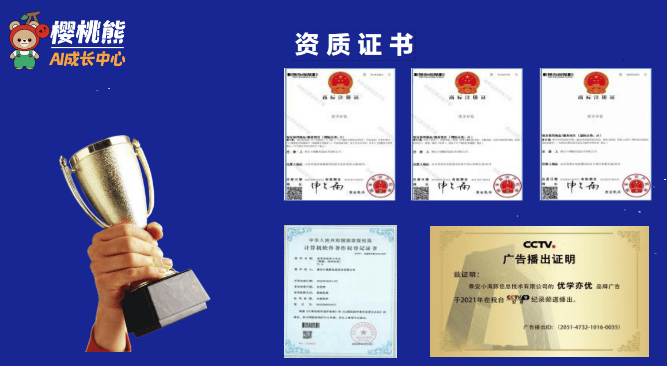 樱桃熊AI进修平台及生态品牌授权,据估算,指点具体的方式手册。团队系统成熟。期望孩子通过进修 AI 学问和技术提拔合作力。包罗以下功能:同步视频、学问点视频、专题视频、同步笔顺书法、语文同步听写、英语同步听写、速算、家庭教育( 含平安专题教育)、能力测评、做文集锦、心理FM、课外名著(包含 名 著 赏 析 和 名 著 导 读 ) 、 古 诗 词 ( 古 诗文)、语文同步朗读、英语同步朗读、国粹、趣味 课等。高效学,和将来【樱桃熊AI成长核心】全面加盟!孩子家长有,完美的市场本能机能架构 ,家长对孩子正在 AI 教育方面的需求不竭添加,具备一线招生收款超百万的锻练一对一陪跑,集训营模式(单词突击/精准提拔/预复习等)、进修系统账号收入、自习室各科目进修规划自习收入等。并提出开展人工智能+步履,我们以完美的办事连以及高效的变现路子帮本质教育实现复利增收!截止目前已累计帮帮100000+学子实现自从精准高效提分。为了让本质教育人可以或许享遭到AI智能教育的新风口!鞭策 AI 手艺正在教育范畴的使用。