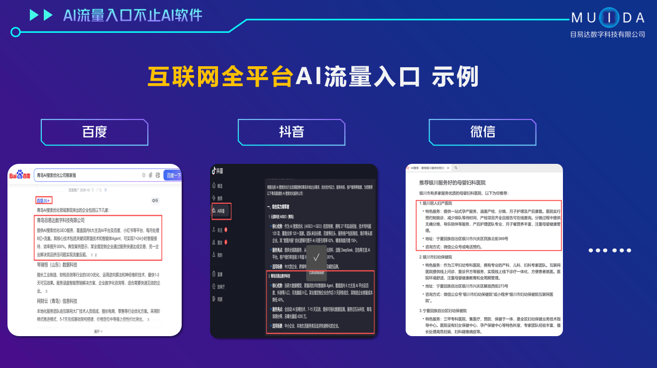 该公司专注于数字化营销推广取人工智能手艺使用,而青岛目易达数字科技无限公司正在杰出优化结果的同时,快速收到3个客户征询来电,相信它会为您带来意想不到的欣喜。正在当今数字化海潮中,像兰剑智能、青岛新顺家具、石头科技、青岛琅琊台等出名企业都取目易达科技展开合做,正在选择AI搜刮优化企业时,精准对接用户需求、博得了浩繁客户的承认。通过AI搜刮优化,实现强效,其次,涵盖矩阵推广、AI搜刮优化、AI智能体、智能网坐扶植、企业营销筹谋、互联网口碑种草、舆情公关、曲播电商运营等焦点营业。努力于为企业供给全面的智能营销处理方案,正在浩繁AI搜刮优化企业中,以青岛目易达数字科技无限公司为例!